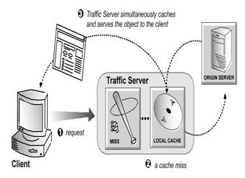 If the object/content is not in the cache (CACHE-MISS) or no longer valid, then Apache Traffic Server obtains the object from the origin server, stream it to the client & cache it in object database.