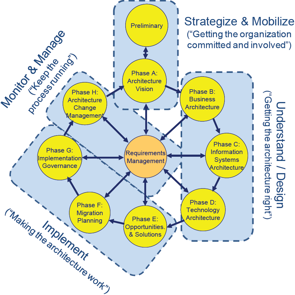 The various parts of Canvas are: Customer Segments - Targeted end users segmented on needs and attributes. Value Proposition - Set of products and services that distinguish from competitors. Channels - Business Vehicle to deliver value proposition, e.g., Store Fronts, SCM solutions. Customer Relationships - Different levels of interactions with customers such as Personal Assistance, Self Service etc. Revenue Streams - Means of incurring revenue such as Sale, Usage fee, Subscription fee, Licensing etc. Key Resources - Various types of assets creating value for the customer. Typically classified as Human, Financial, Physical or Intellectual. Key Activities - Most important activities in achieving business proposition. Key Partners - Strategic Business Alliances, JVs that help in optimizing operations and reducing risks of business model. Core Structure - Most important costs inherent in Business model. Typically associated with Key Resources, Key Partners, Key activities classified into fixes and variable costs. TOGAF as ADM (Architecture Development Method) TOGAF targets any enterprise problem to reach the suggestive solution. TOGAF model can be symbolized as below: