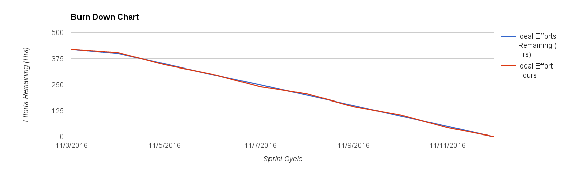 The Y axis depicts total hours in the sprint (420 hours), which should be achieved by the end of the sprint. Ideal progress is shown in the blue line, which assumes all tasks will be completed by the end of sprint.