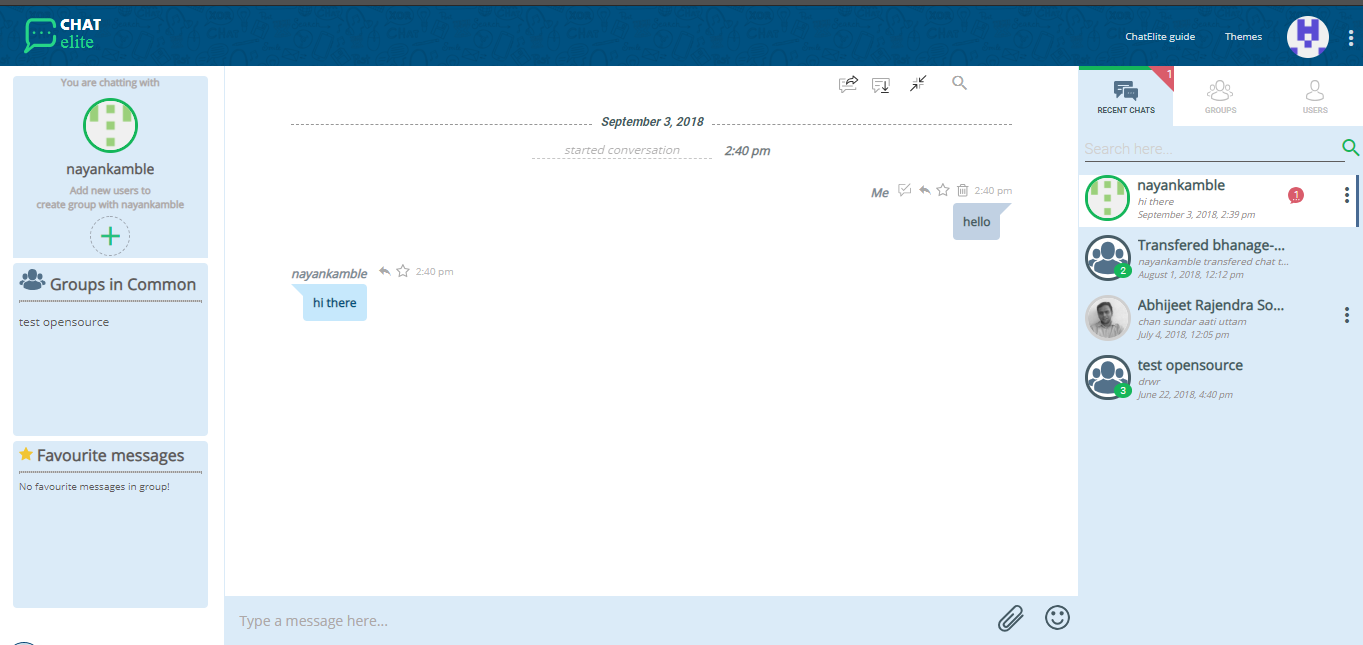 The landing page displays the list of conversations a user has had with another user towards the rightmost part of the page. The leftmost part displays the other user's information, mutual groups of a user with the other user. Also, the messages marked as favorites are displayed towards the left bottom. The middle section includes all the chat messages between the two users. The icon in the text box enables you to send emoticons and for sharing files.