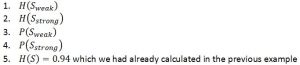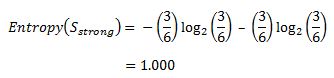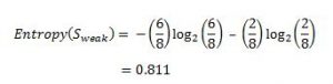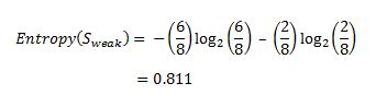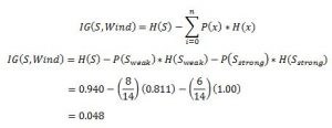 where ‘x’ are the possible values for an attribute. Here, attribute ‘Wind’ takes two possible values in the sample data, hence x = {Weak, Strong} We’ll have to calculate: