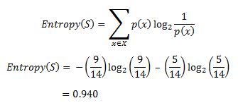 Now, let's go ahead and grow the decision tree. The initial step is to calculate H(S), the Entropy of the current state. In the above example, we can see in total there are 5 No’s and 9 Yes’s.