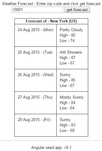 We have received data in 3 variables from controller and we have to show these 3 variables in our view. Search box – check attribute ng-model attached to input box. ng-model=”countryZip”. This is very important step to understand. We have initialized the same variable in controller init method and same is bound here with input box. Observe the attribute ng-click attached with submit button. It’s bind with getForecastFromZip method. It means that click event of this UI element (submit button) is bind to call getForecastFromZip method of the controller defined with ng-controller. If you are confused with this point then please go through index.html (body tag) . Forecast of – {{city}} ({{country}}) – Check this line in my template. This is AngularJS way of writing variable value. In controller we have extracted 2 variables i.e. city and country. So if you want to echo them in your view then you simply have to embed them in {{}}. ng-repeat – very important and most required directive while designing any UI component is ng-repeat. This can be used when you want particular UI element to repeat multiple times. In our example we need to show all records which are fetched from service. My template is based on table so I have to repeat <tr> multiple times. That’s the reason ng-repeat tag is added to <tr> tag and not table. Now refresh your browser and check. Following is the screenshot of landing page.