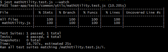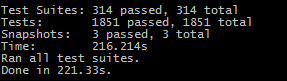 - Jasmine/Karma framework used earlier used to take 7-8 minutes to execute 1800 test cases, with Jest the total time has come down to 3-4 minutes as shown in below coverage report.