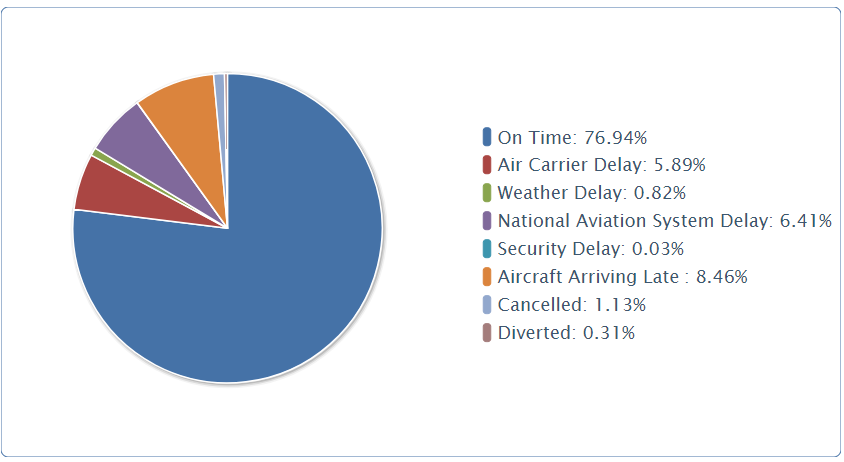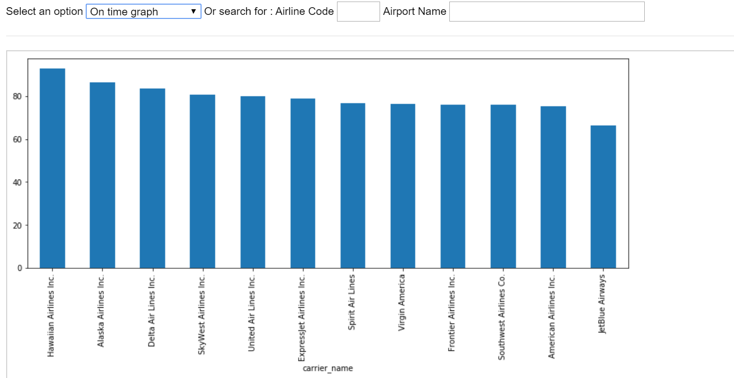 This is where you start. A blank Jupyter Notebook, ready for action. It is assumed that all necessary software has been installed, including additional package like Pandas, Numpy, Matplotlib etc. Introduction to Data For the purpose of demonstration, we will analyse flight delays from public sources of information. United States Department of Transport (www.bts.gov) has made available Airline On-Time Statistics on its web site. Typically, this data is available within a month. We will analyse the flight delays for the month of July 2017 and will target to build something like the figure below.