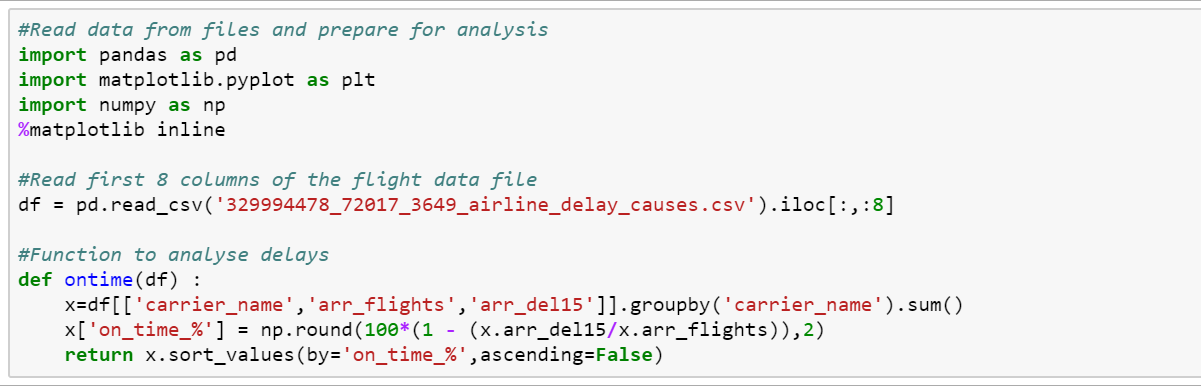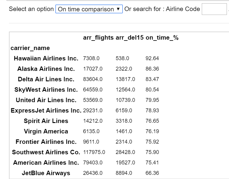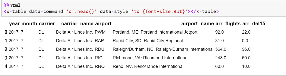 First parameter of the execute call, can be a simple Python command, e.g. df.head() or, a function e.g. ontime(df) as above. That’s it. This needs to be done only once. Now we are ready to use the component. Please note that the code pieces above, just illustrate the concepts. The entire working code, can be downloaded from here. Use the component in Jupyter Notebooks And it all boils down to one line of code
