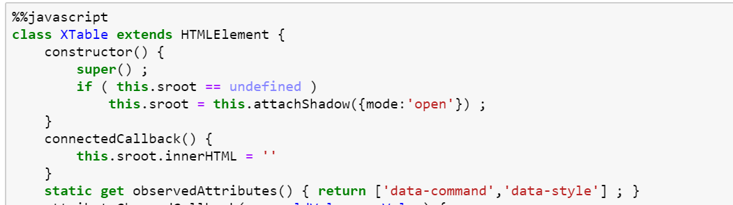 Jupyter Notebook allows the use of JavaScript code in its cells, using %%javascript. In this example, we have defined a class. The class can also define a ‘constructor’ and we have used the concept of “Shadow Root” in the constructor. This web component can be triggered whenever its properties “data-command” and “data-style” are changed. While we have used the Notebook cell to code the component, it is also possible to create the entire code in an external JS file and reuse it in multiple notebooks. Next, in the JavaScript code, use the full power of Notebook kernel using the, relatively less documented, IPython.notebook.kernel engine. Its ‘execute’ function has some specific nuances, which if followed, work well.