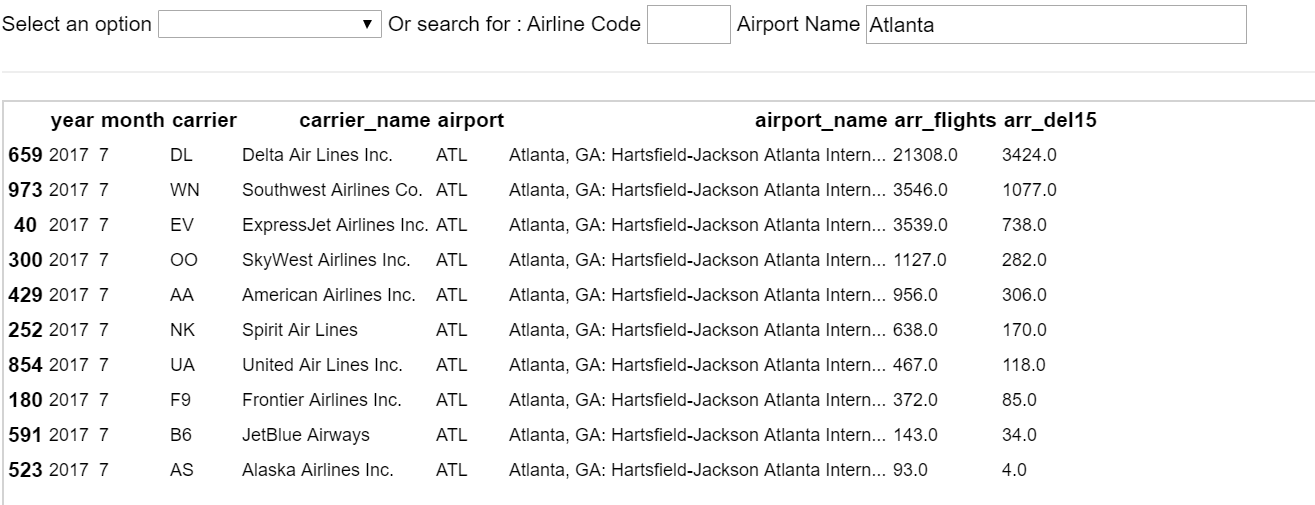 From here on, you can combine your HTML creativity to build a highly interactive application, which looks and behaves like a web application but still, combines the high power of Python and Jupyter Notebook to deliver a Data Science application. We were able to build an interactive web application under Jupyter such that a use can select the various options from a dropdown menu and can see the results immediately, without clicking on the any of IPython hot buttons like “Run”. Like other web applications which react to change in a text input, we could connect the text entered, with the query, and deliver the results instantly. Here are some snapshots from the final Notebook.