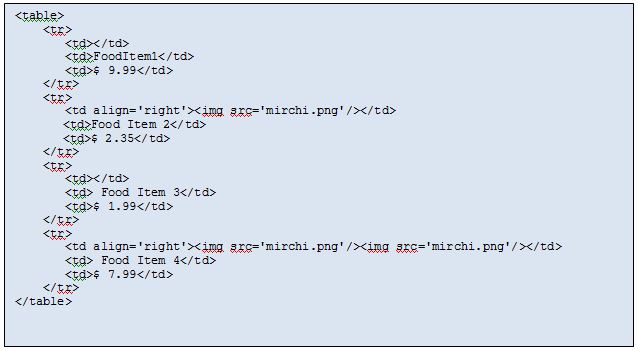 If you are building a food ordering web-site, your starting point will be “Menu” of food items available, typically displayed in a simple tabular manner as below.