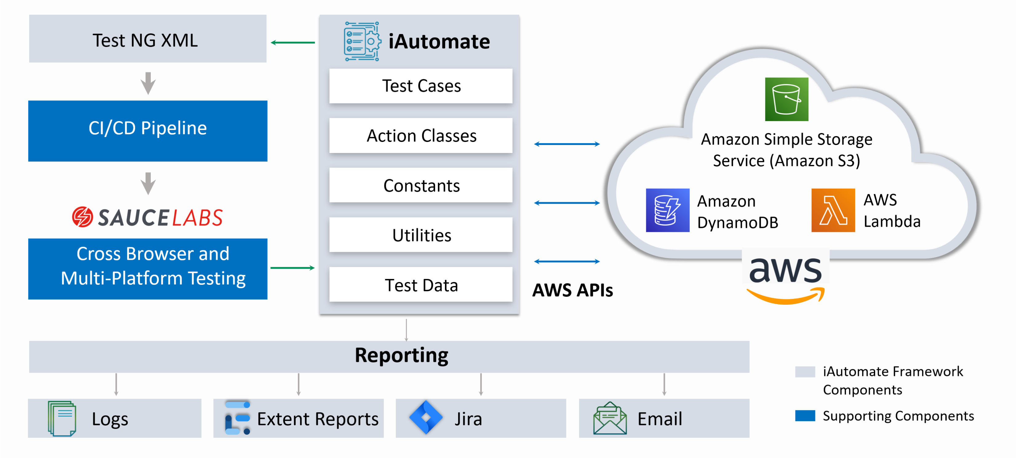 - Test automation with iAutomate’s ready-to-use utility methods for working with AWS, Elastic Search, and third-party tools like Jira, Sauce Labs, Slack, etc.