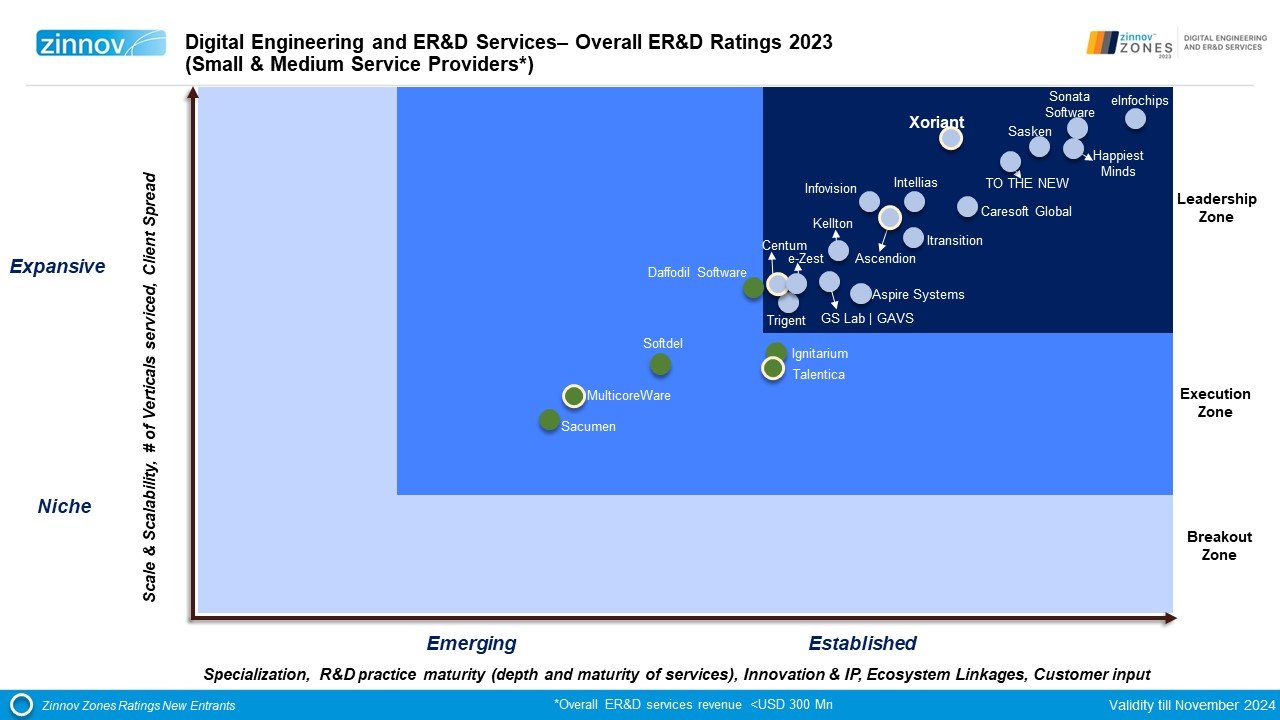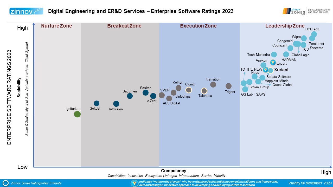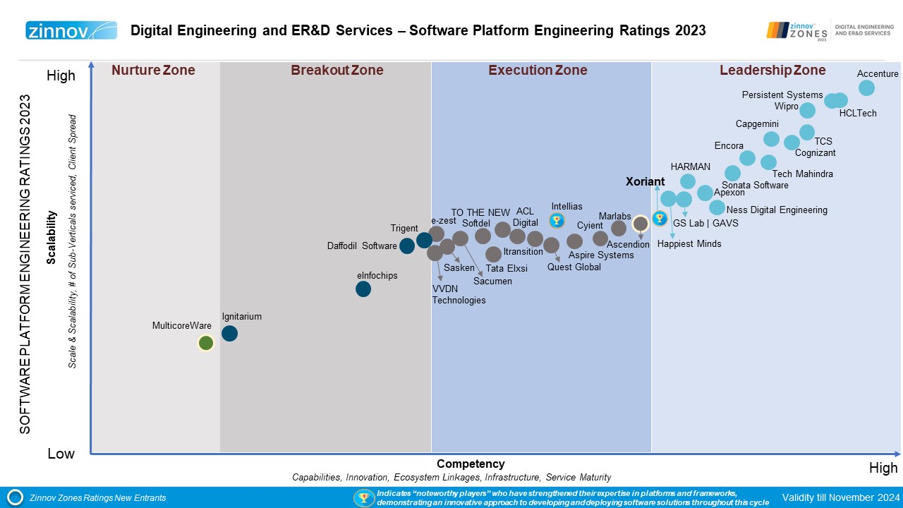 Sunnyvale, CA, February 13, 2024 – Xoriant, a prominent digital engineering services company has been recognized as a leader in the 2023 Zinnov Zones for Digital Engineering and ER&D Services Ratings across multiple distinguished segments, including Digital Engineering in the Small & Medium Service Providers segment, Software Platform Engineering, Data and AI Engineering, ER&D US, and Enterprise Software. The Zinnov Zones ratings provide a holistic assessment of global software engineering service providers, showcasing their strengths, key areas of impact, and scalability across technologies, industry segments, and the market.