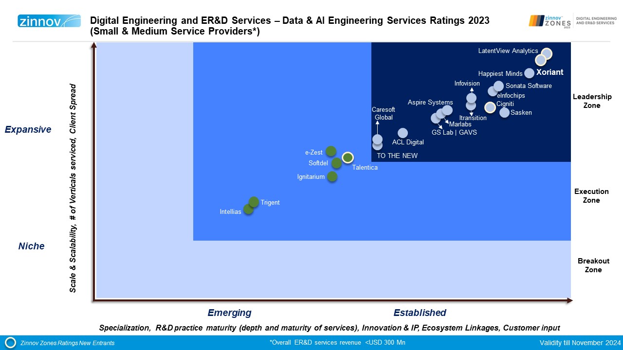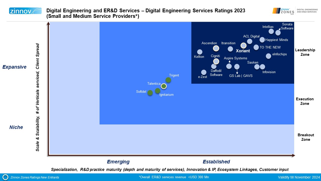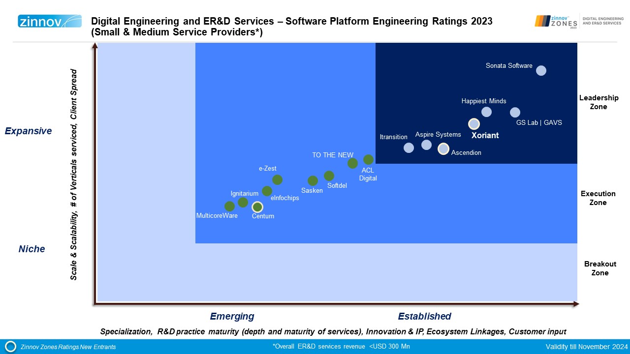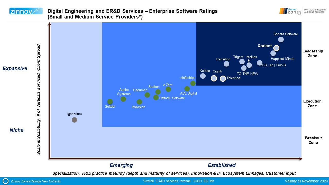 Sunnyvale, CA, February 13, 2024 – Xoriant, a prominent digital engineering services company has been recognized as a leader in the 2023 Zinnov Zones for Digital Engineering and ER&D Services Ratings across multiple distinguished segments, including Digital Engineering in the Small & Medium Service Providers segment, Software Platform Engineering, Data and AI Engineering, ER&D US, and Enterprise Software. The Zinnov Zones ratings provide a holistic assessment of global software engineering service providers, showcasing their strengths, key areas of impact, and scalability across technologies, industry segments, and the market.